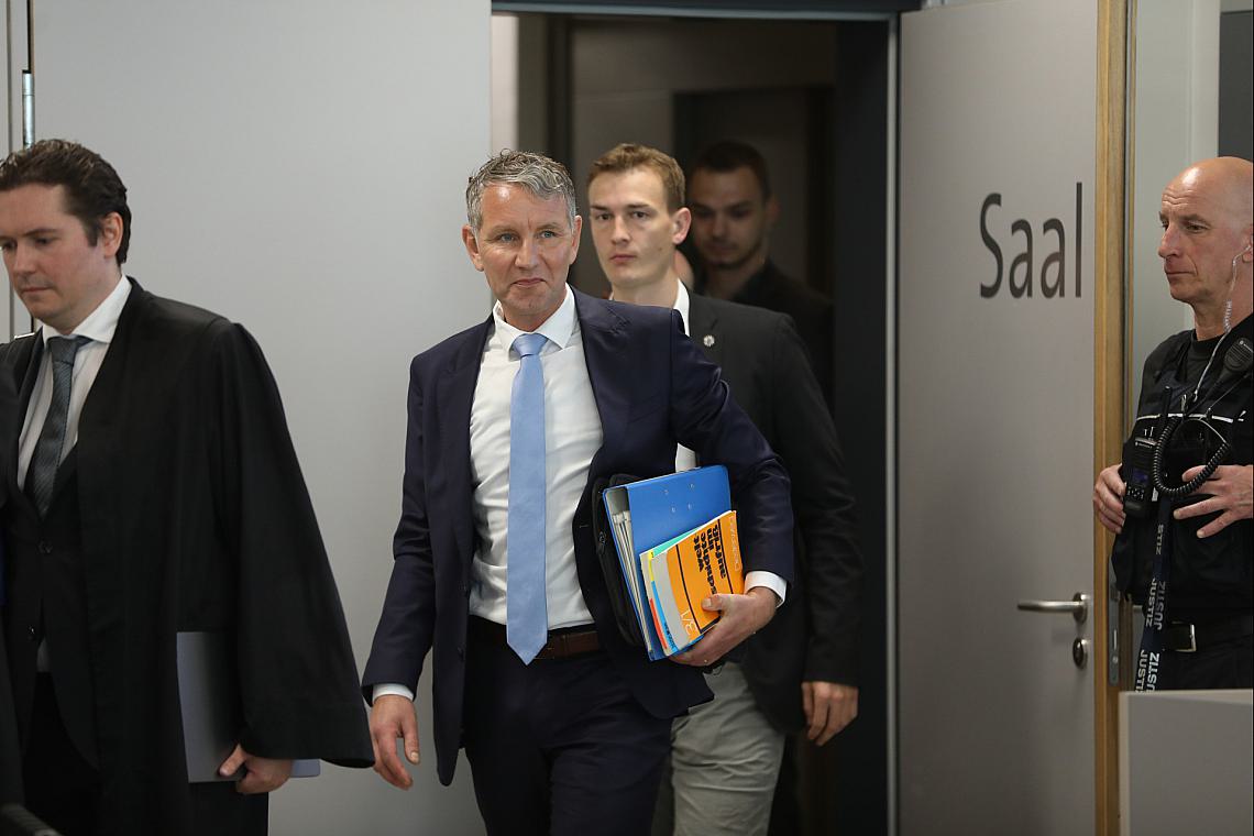 Vor dem Landgericht in Halle begann am Donnerstag ein Prozess gegen Höcke, dem das Verwenden von Kennzeichen verfassungswidriger und terroristischer Organisationen vorgeworfen wird. Demnach soll der AfD-Politiker am 29. Mai 2021 in Merseburg auf einer Wahlkampfveranstaltung der Partei seine ca. 22 Minuten lange Rede mit der Formel „Alles für unsere Heimat, alles für Sachsen-Anhalt, alles für Deutschland“ beendet haben, wobei er gewusst haben soll, dass es sich bei dem letzten Teil dieser Formel um eine verbotene Losung der Sturmabteilung (SA) der NSDAP handelt.