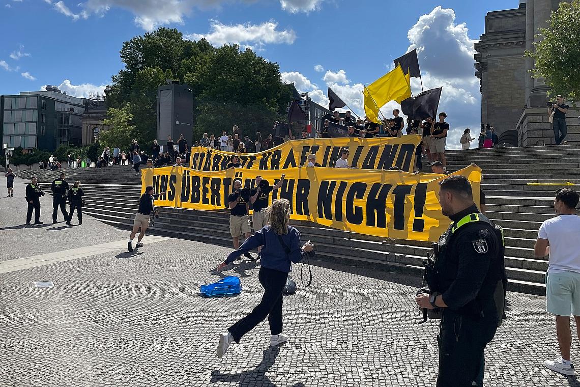 Mutmaßliche Aktivisten der „Identitären Bewegung“ haben am Sonntag versucht, das „ARD-Sommerinterview“ mit Markus Söder zu stören. Am Mittag versammelten sich etwa ein bis zwei Dutzend Männer in schwarzen T-Shirts, mit Fahnen und einem großen Banner auf der Treppe vor dem Reichstagsgebäude. Dabei in großen Lettern zu lesen: „Stärkste Kraft im Land – uns übertönt ihr nicht“, außerdem wurde immer wieder „Remigration“ gerufen.